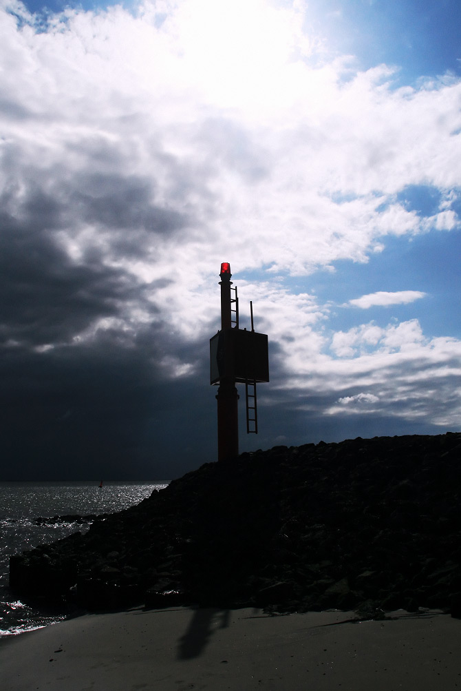 ‹ Am Ende der Buhne »W« befindet sich ein Seezeichen, auf dessen Spitze in der Dunkelheit zur besseren Sichtbarkeit ein rotes Licht leuchtet.