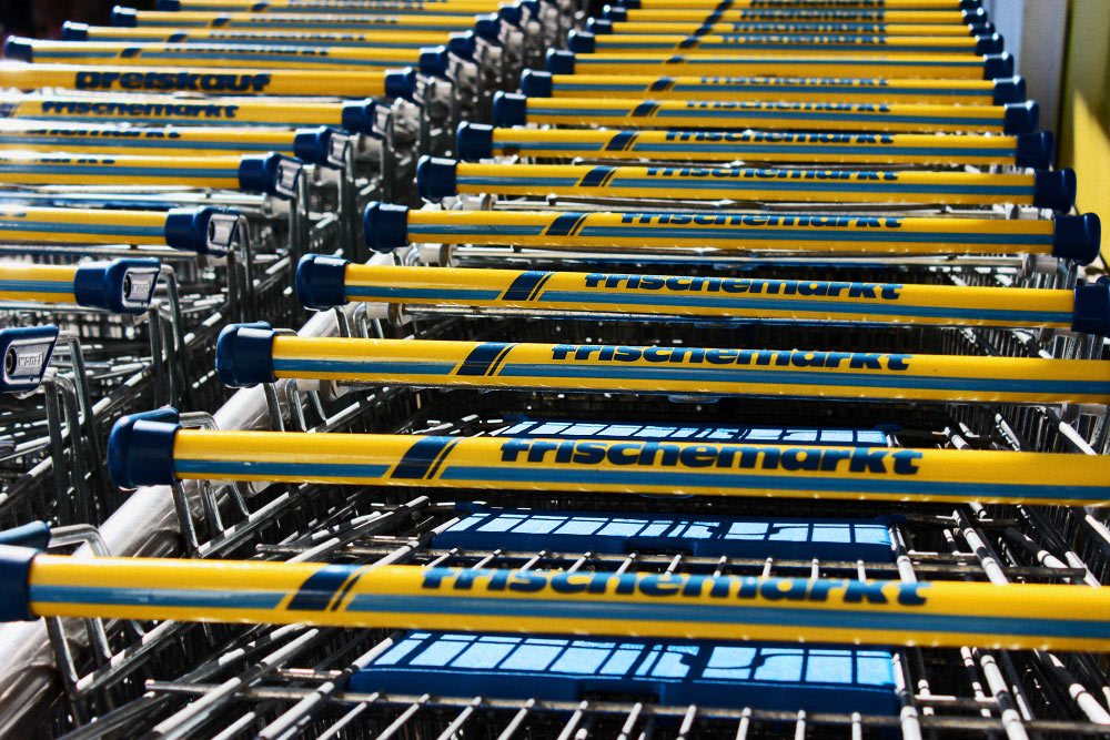 Ganz viele Einkaufswagen mit Edeka-typisch gelb-blauen Griffen vorm Wangerooger »Frischemarkt«. Ein alter »Preiskauf«-Griff ist auch dabei und sticht richtig aus der Masse heraus.