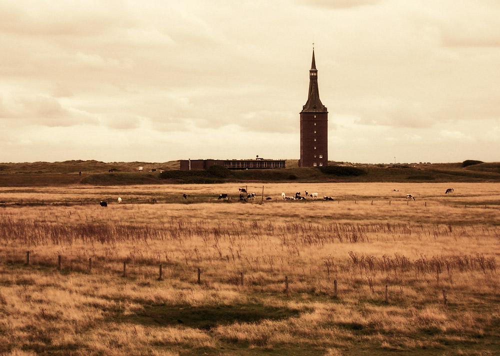 Der 1933 neu errichtete Westturm überragt den Westinnengroden, auf dem einige schwarz-bunte Rinder grasen.