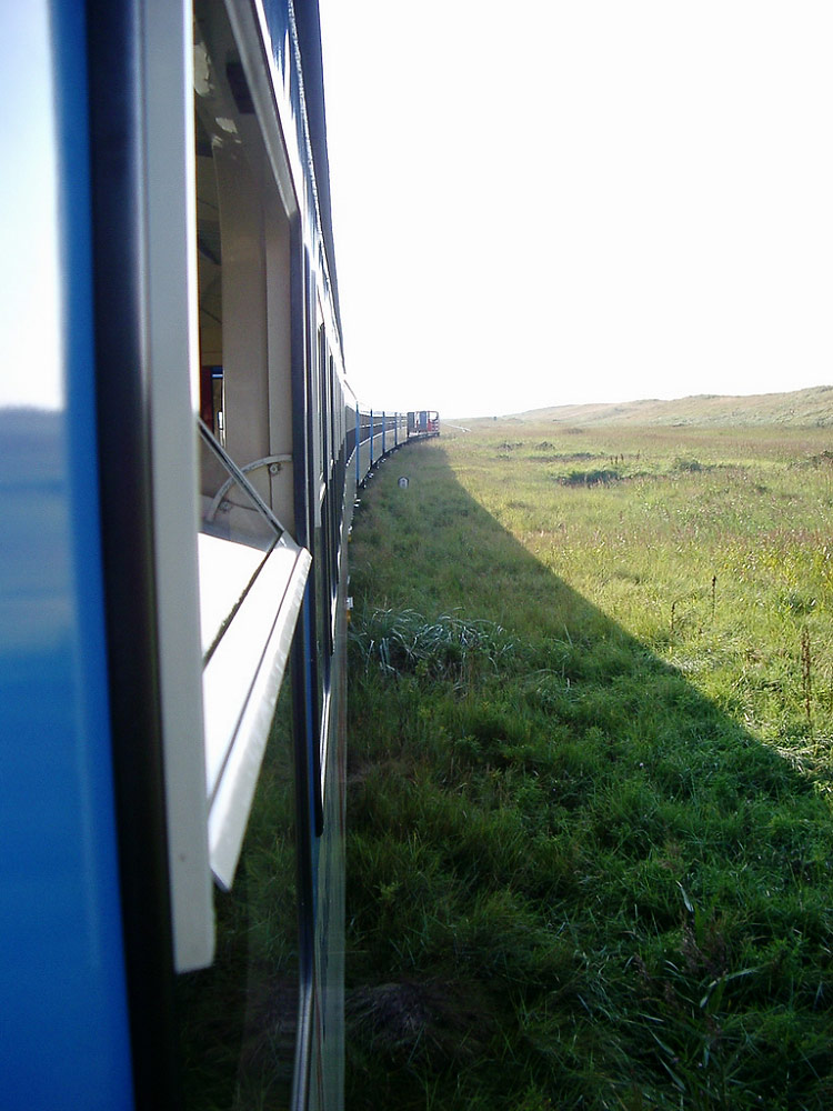 ‹ Die Inselbahn durchfährt hier soeben das Deichvorland unterhalb des Süddeichs (rechts im Bild).