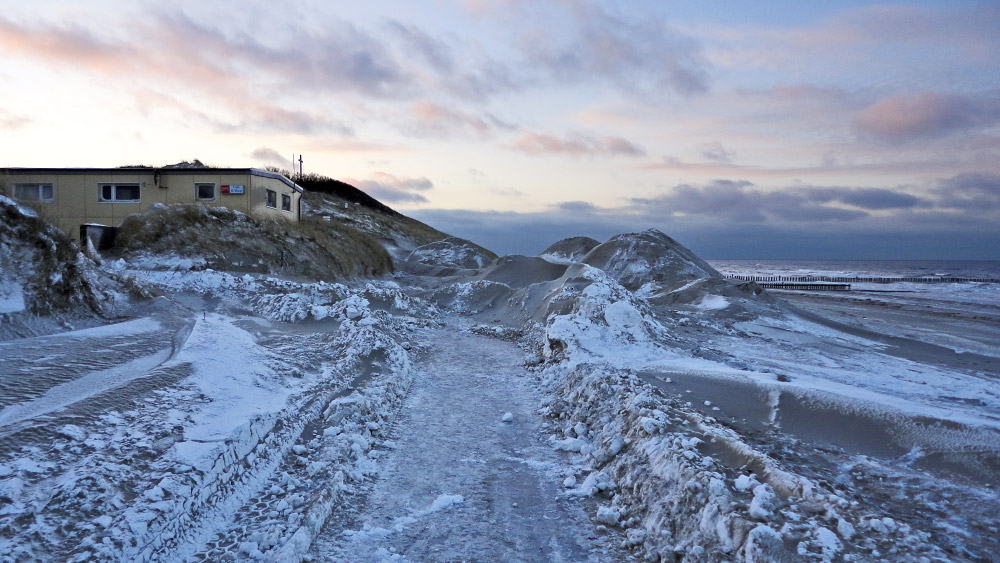 Die Strandmauer am Surfstrand im Winter. Notdürftig wurde sie teilweise von den Schnee- und Sandmassen befreit, so daß man auf einer Breite von ca. 1,5 Metern relativ komfortabel laufen kann. Um zum (ohnehin geschlossenen) Surfkiosk zu gelangen, muß man allerdings ein bißchen klettern.