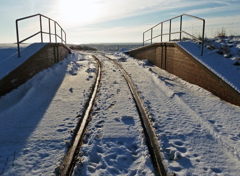 Nachdem die Müllpreßstation westlich des Dorfes erbaut wurde, errichtete man auch einen Gleisanschluß für die Inselbahn sowie im Süddeich ein Deichschart, das wir hier vor uns sehen.