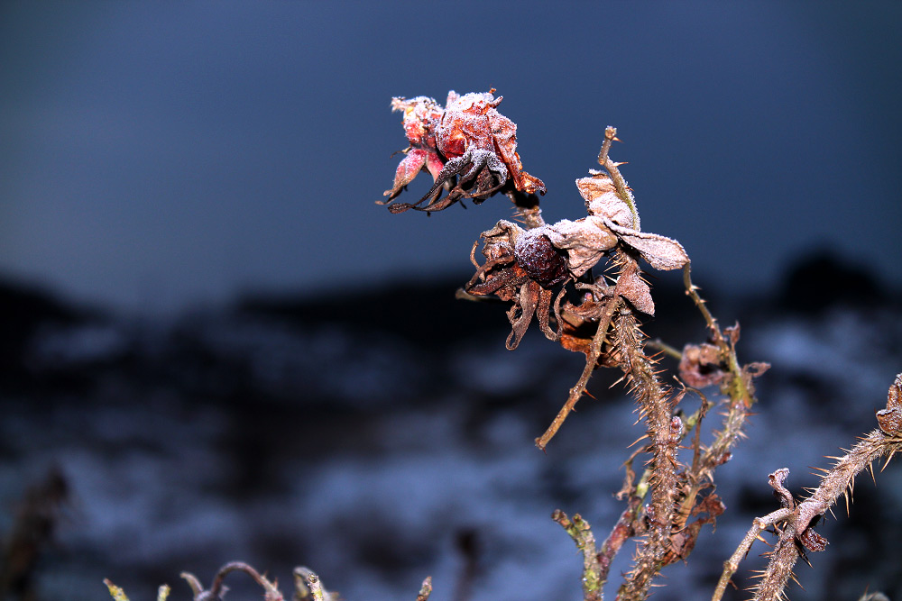 Mit den Hagebutten ist nicht mehr besonders viel los, sie sind doch reichlich verdorrt und außerdem von Reif bedeckt.
