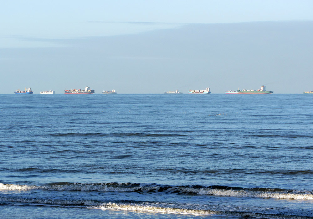 Zahlreiche Schiffe, größtenteils Containerschiffe, liegen hier vor Wangerooge auf Reede.