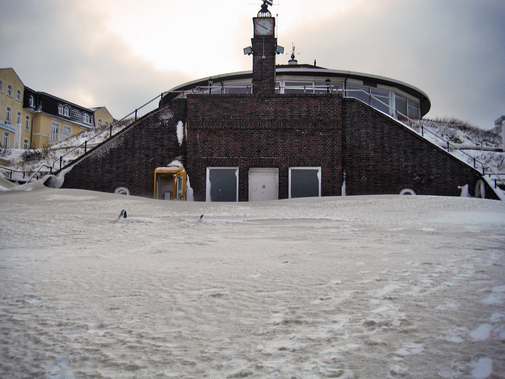 Die Hauptuhr mit Treppe unterhalb des »Puddings«. Vor ihr türmen sich wahre Sandberge auf, das alles wird nicht einfach mit ein paar Besen wieder sauberzumachen sein.