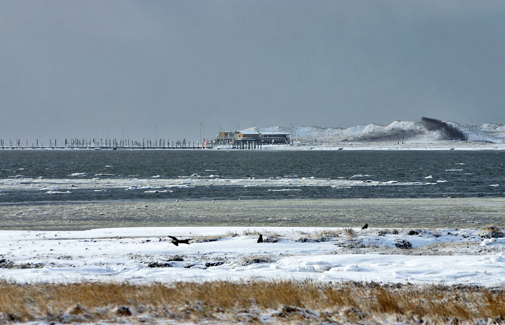 Die Bucht zwischen dem Harle Hörn und dem Süderheller nennt sich »Salinebucht&lauo;. Im Hintergrund der Westanleger, noch ohne das Fährschiff.
