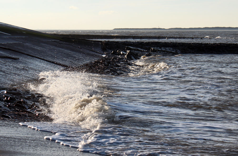 Das Westende der Insel ist durch das Westdeckwerk schwer befestigt, hinzu kommen einige Buhnen, die die Strömung und den Sandabtrag verringern sollen. Im Hintergrund sehen Sie die Spiekerooger »Ostplate«.