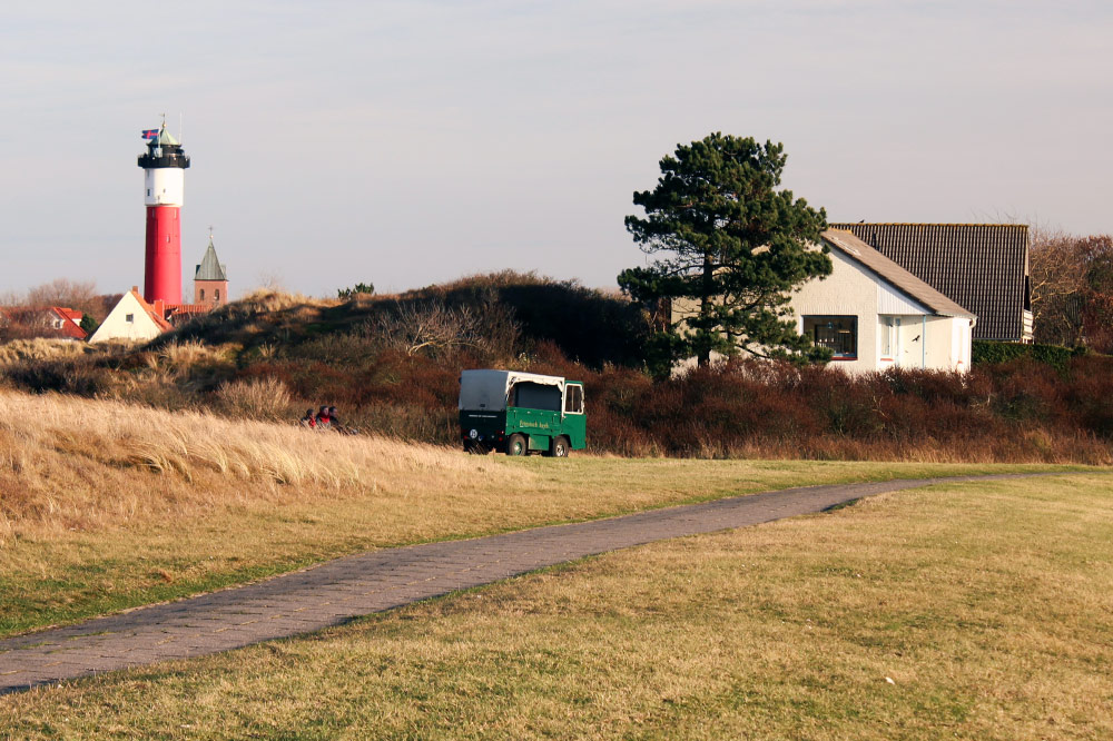 Der mit Dünengras bewachsene Süddeich ist hier zu Ende, dort vorn beginnt bereits das Inseldorf mit der Straße »Am Wattenmeer«.