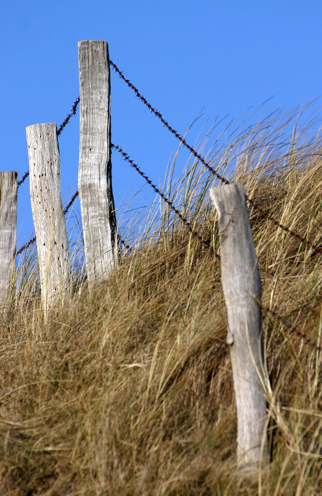 ‹ Noch immer befinden wir uns an der Dünenüberwegung »Bootsweg«. Das Dünenschutzgebiet wird durch einen Stacheldrahtzaun vor unbefugtem Betreten geschützt. Die Pfähle sind zwar teilweise schon sehr verwittert, aber solange sie halten, ist ja alles in Ordnung.