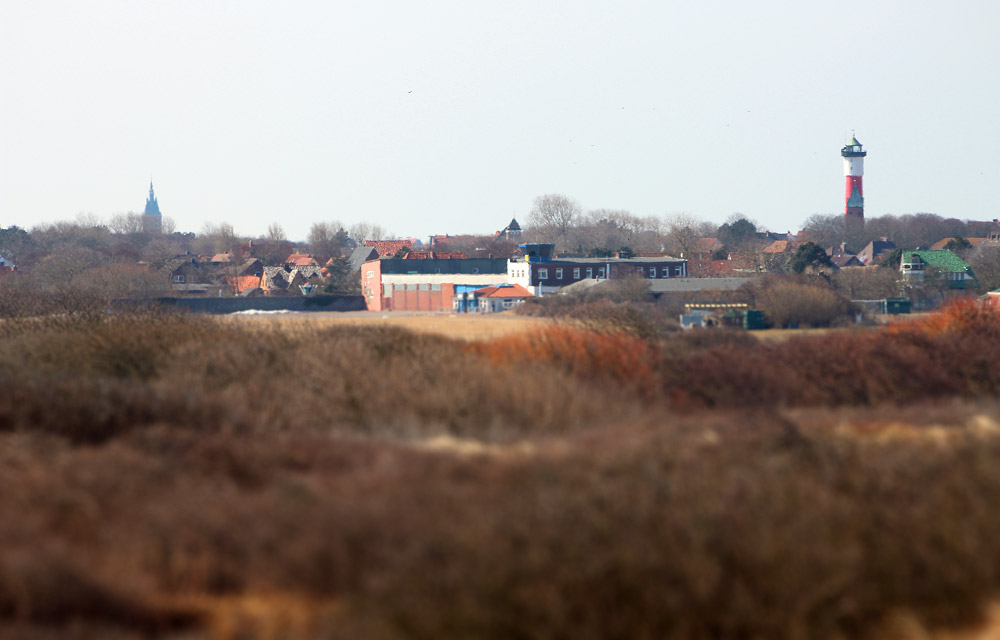 Vom höchsten Punkt der Überwegung »Kläranlage« kann man gut den Flugplatz und den Alten Leuchtturm sehen. Außerdem in der Bildmitte der Bahnhof und links der Westturm, der sich am anderen Ende der Insel befindet.