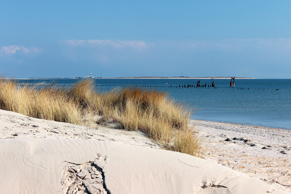 Der Ostanleger bei Hochwasser. Bei niedrigeren Wasserständen kann man zwischen den Pfahlresten hindurch laufen. Zwischen dem Ostende von Wangerooge und der Nachbarinsel Minsener Oog befindet sich das Seegatt »Blaue Balje«.