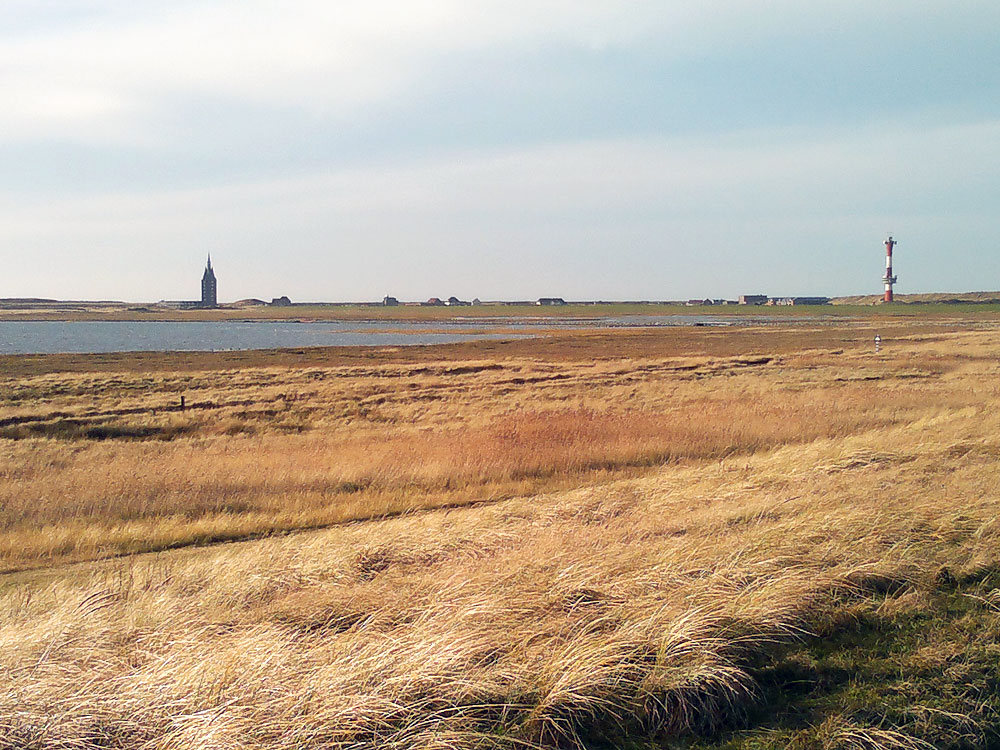 Vom Süddeich aus hat man einen guten Blick auf die beiden Türme des Inselwestens. Davor befindet sich das Deichvorland mit Salzwiesen und Lagune, beides durch den Nationalpark streng geschützt.