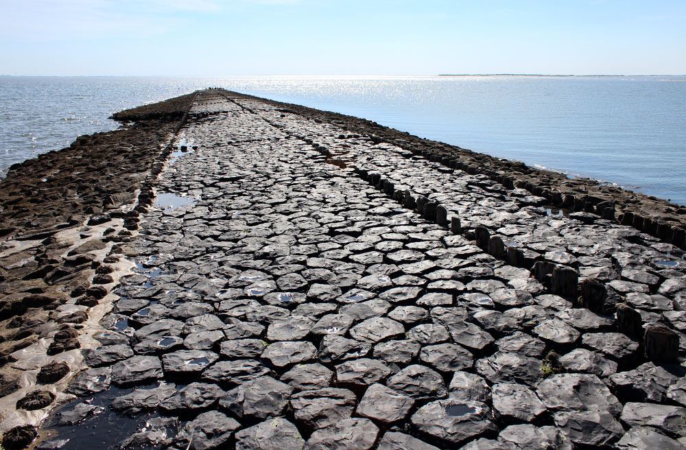 Bei Niedrigwasser kann man auf der Buhne »U« ein ganzes Stück in Richtung Südwesten laufen. Rechts am Horizont sehen Sie das Ostende der Nachbarinsel Spiekeroog.
