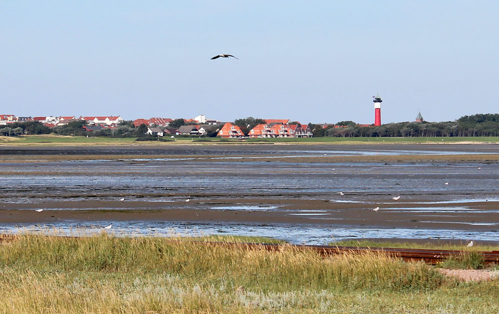 Bei Niedrigwasser wird die »Salinebucht«, die den Westanleger vom Inseldorf trennt, nur noch von schmalen Prielen wie dem »Bootstief« durchzogen. In ca. sechs Stunden wird es hier bereits wieder ganz anders aussehen.