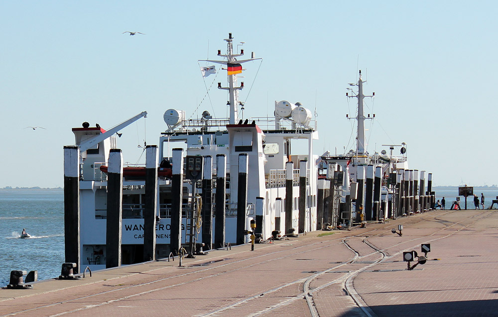 Bei Niedrigwasser findet kein Fährbetrieb statt, die beiden Schiffe MS »Wangerooge« und MS »Harlingerland« liegen derweil am Anleger und warten auf die nächsten Fahrten.