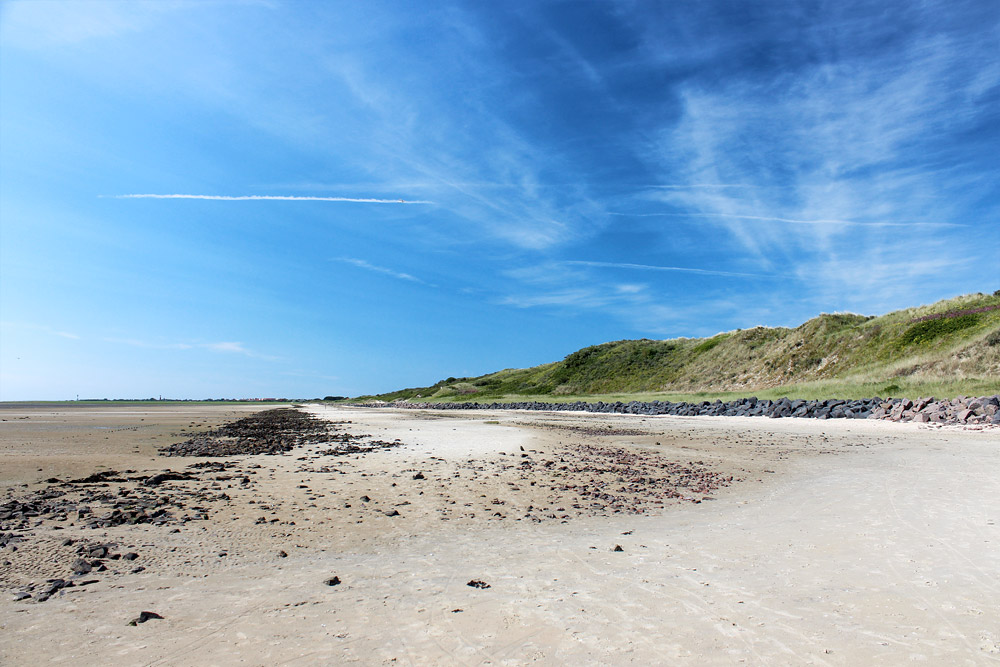 Wir laufen weiter in Richtung Ostende, hier ein kurzer Blick zurück. Der linke Steindamm diente bis 1958 der Inselbahn, der rechte dagegen dient dem Hochwasserschutz, denn auch von der Wattseite her können die Dünen bei Sturmfluten vom Wasser angenagt werden.