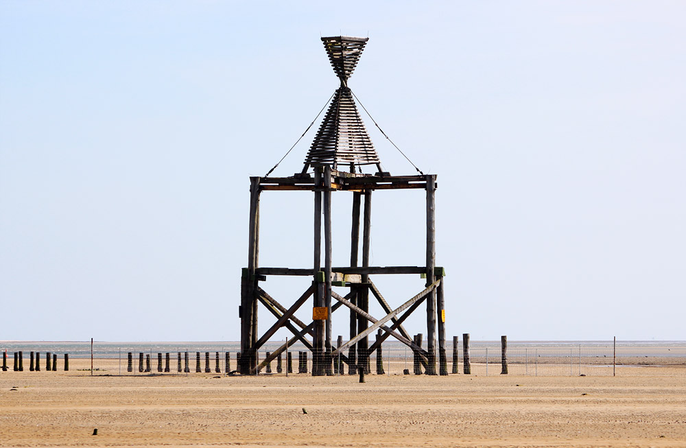 Dieses Foto ist mittlerweile bereits historisch, denn die Ostbake gibt es leider nicht mehr. Ihr Holz war derart morsch, daß nur noch ein kompletter Abriß half. Errichtet wurde sie als Seezeichen im Jahre 1909 inklusive einer Unterkunft für Wasserbauarbeiter. Die Baracke wurde bereits 1990 abgerissen, doch u. a. dank einiger Bürgerproteste blieb die restliche Konstruktion noch bis 2013 bestehen.
