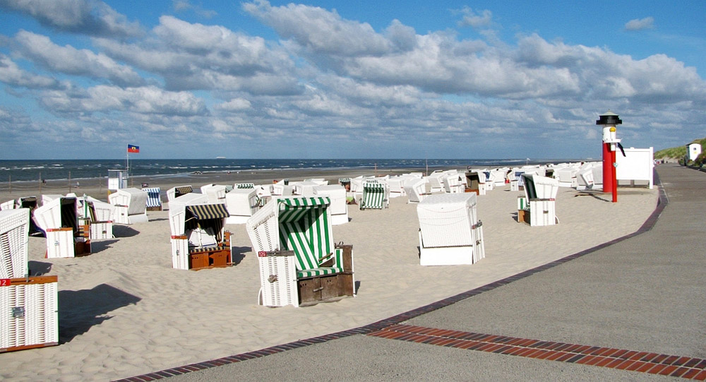 Ein Blick von der Strandmauer aus hinunter zum Ostfeld, das sich in von der Westingstraße aus ostwärts bis zum Hundestrand erstreckt. Wie unterhalb der Uhr befindet sich auch hier ein Badefeld mit Badeturm und Leuchtturm-Dusche. Die Badekarre des Strandwärters ist ganz rechts zu erkennen.