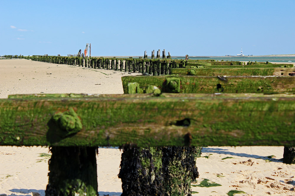 Östlich der Strandbake fuhr die Inselbahn über eine Pfahljochstrecke bis hin zum damaligen Ostanleger (im Hintergrund sichtbar). Auch heute, mehr als 50 Jahre nach Aufgabe der Anlegestelle, sind noch immer zahlreiche Schwellen vorhanden.