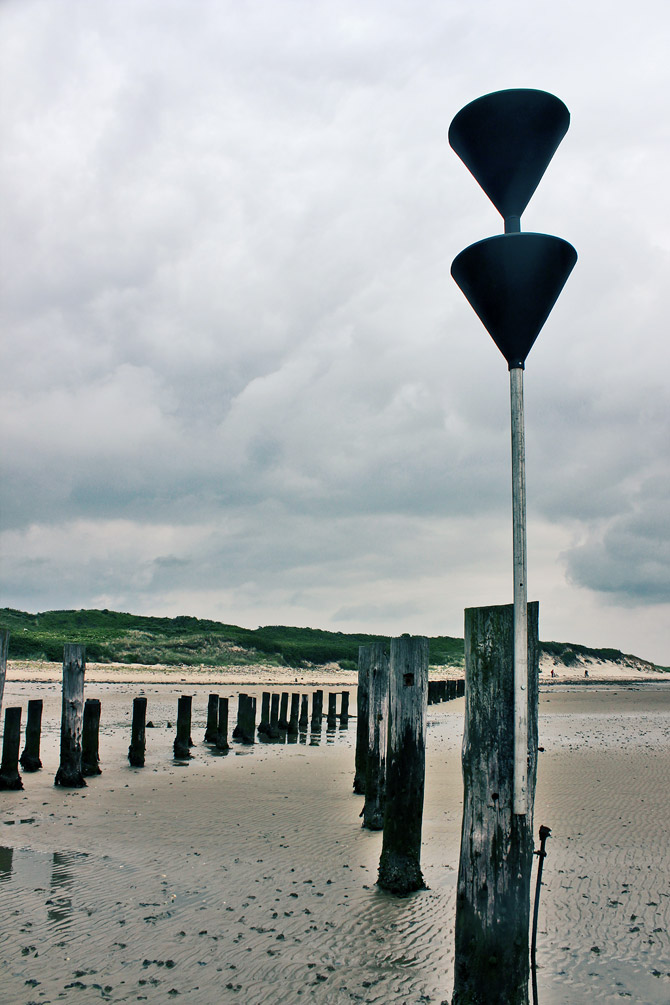 ‹ Ein kardinales Seezeichen (Toppzeichen: Gefahrenstelle südlich umfahren) ersetzt seit dem Frühsommer 2013 die ehemalige Ostbake.