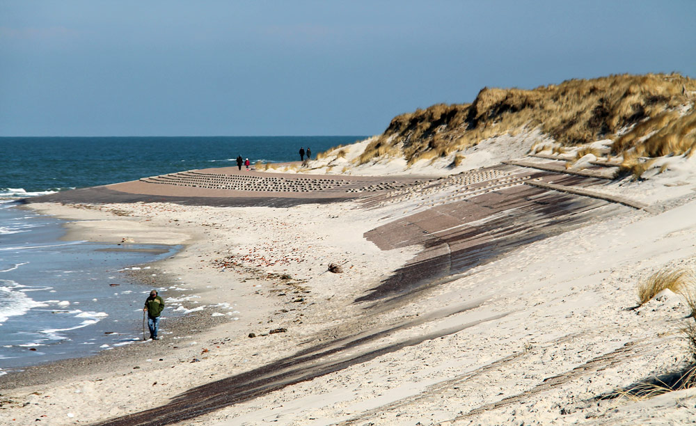 Das Westdeckwerk ist in diesem Abschnitt teilweise von Sand bedeckt, auch ein wenig Strandhafer wächst dort bereits.