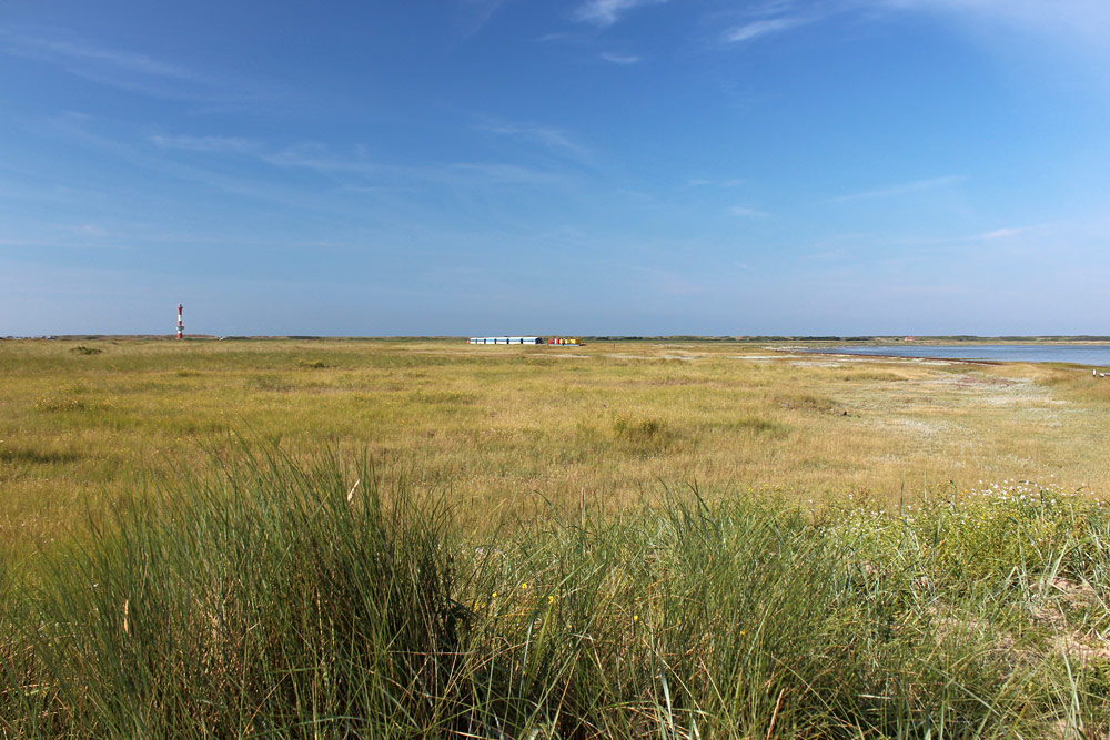 Die Inselbahn ist auf dem Weg zum Dorfbahnhof, sie durchfährt dabei das Naturschutzgebiet im Westaußengroden.