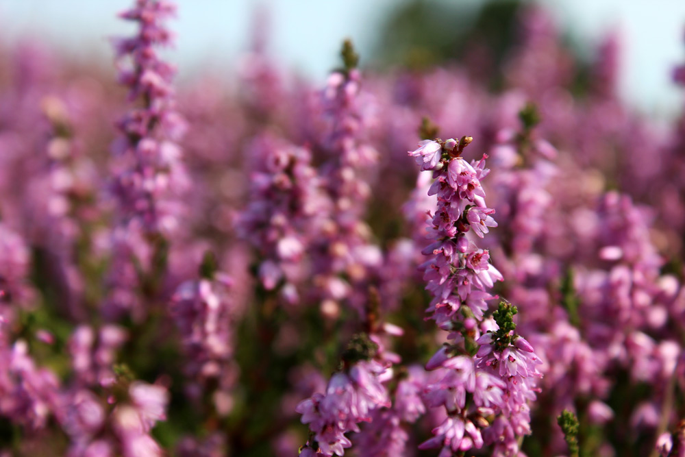 Im Spätsommer erstrahlen Teile der Wangerooger Braundünen im typischen Heidekraut-Rosa. Hier eine Nahaufnahme einiger Blütenstände der Besenheide (Calluna vulgaris).