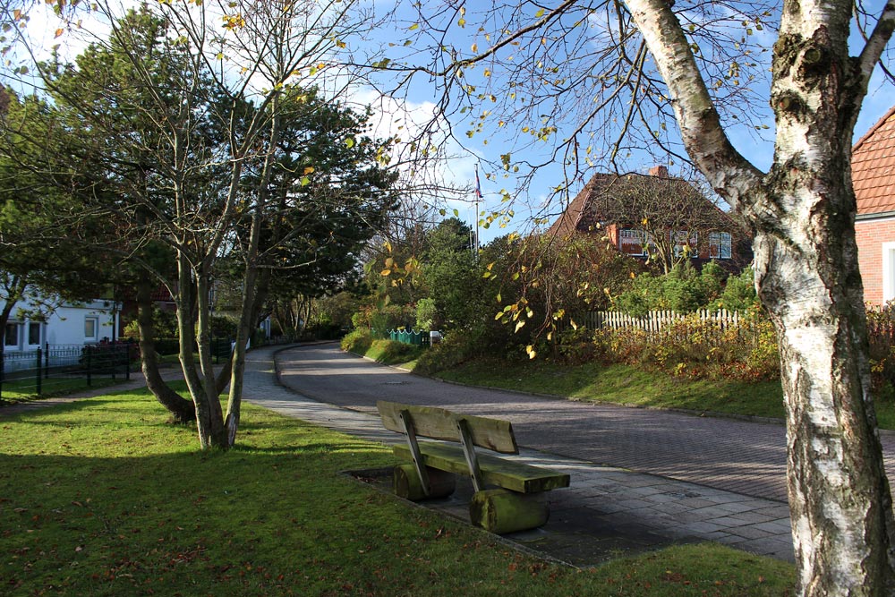 Wir kommen soeben aus dem Verbindungsweg, der von der »Siedlerstraße« zur »Rösingstraße« führt. Die schöne Bank auf der Grünfläche wird leider nur sehr selten von Spaziergängern zum Ausruhen genutzt, es kommen allerdings auch nicht viele Leute hier vorbei.