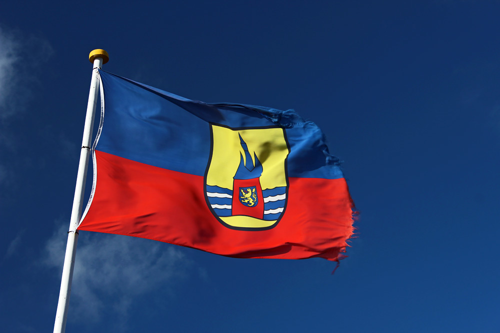 Diese Wangerooger Flagge weht direkt an der Strandpromenade vor dem Eingang zur Gemeinde- und Kurverwaltung.
