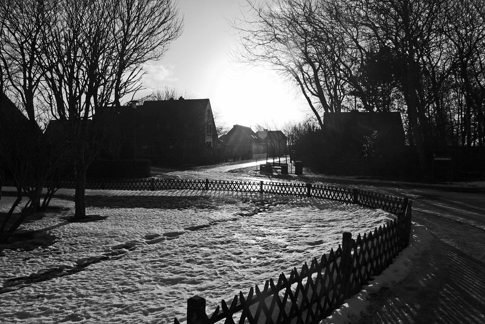 An dieser Kreuzung kann man in zahlreiche Richtungen abbiegen: Ganz links zweigt eine kleine Sackgasse ab, daneben die Straße »Im Dorfgroden« sowie die »Christian-Janßen-Straße«. Ganz rechts geht es außerdem in die Straße »Am Alten Deich« hinein, dies ist aber auf dem Bild nur noch zu erahnen.