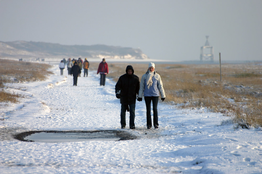 Zahlreiche Spaziergänger kehren dick eingepackt von ihrem Winterspaziergang zum Ostende zurück.