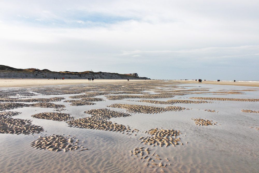 Wie kleine Inseln schauen die Sanderhebungen aus dem Priel hinaus. Links sind die Abbruchkanten deutlich zu erkennen, im Hintergrund befindet sich das Dorf mit dem Haus »Monopol«.
