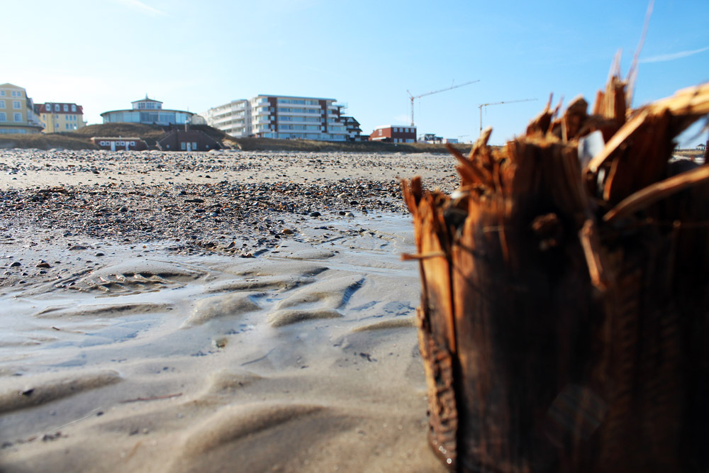 Bei Niedrigwasser kam dieser Pfahlrest am Rande eines Priels zum Vorschein, dahinter sehen wir die Strandpromenade mit »Pudding«, »Monopol« und »Upstalsboom«.