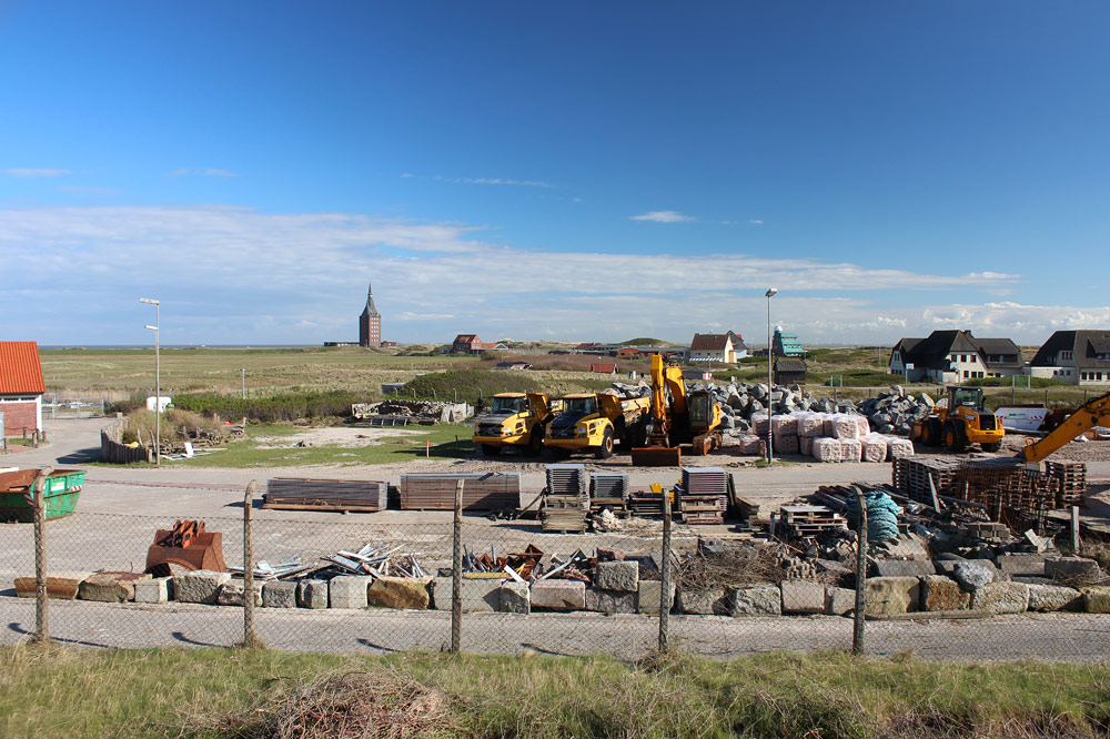 Vom Deckwerk aus kann man den Bauhof des »WSA Wilhelmshaven, Außenstelle Wangerooge« gut einsehen. Neben diversen Baumaterialien stehen dort zum Fotozeitpunkt auch zwei Dumper, ein Bagger und ein Radlader bereit.