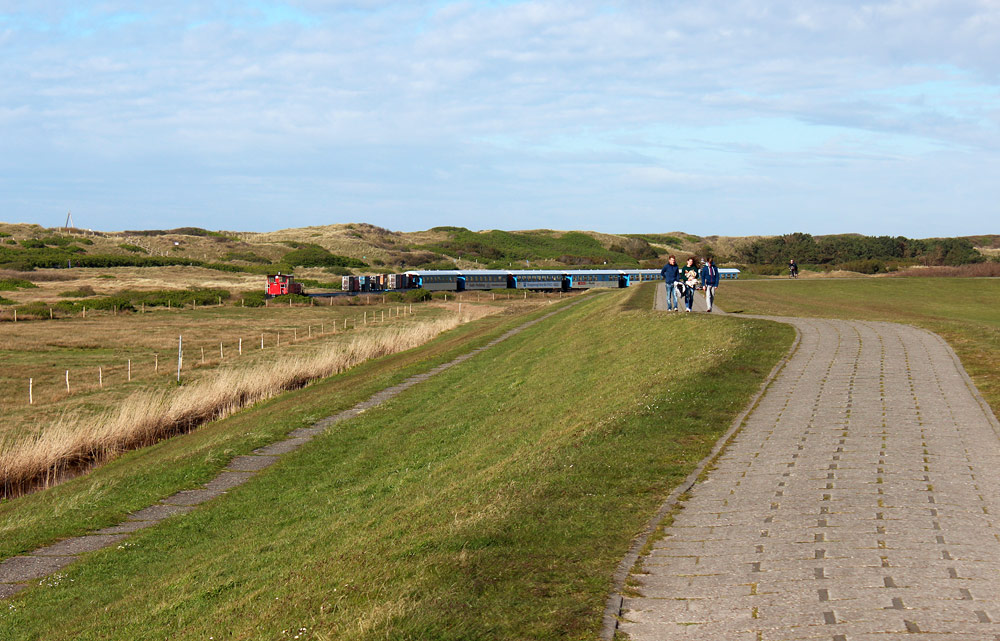 Während wir auf dem Westgrodendeich unterwegs sind, durchquert geradeaus ein Zug der Inselbahn den Westinnengroden.