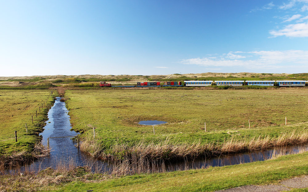 Ein weiteres Foto der Inselbahn, die gerade den Westinnengroden in Richtung Haltepunkt im Westdorf durchfährt. Vorn sehen Sie den Deichgraben, über den der tief gelegene Innengroden entwässert wird.