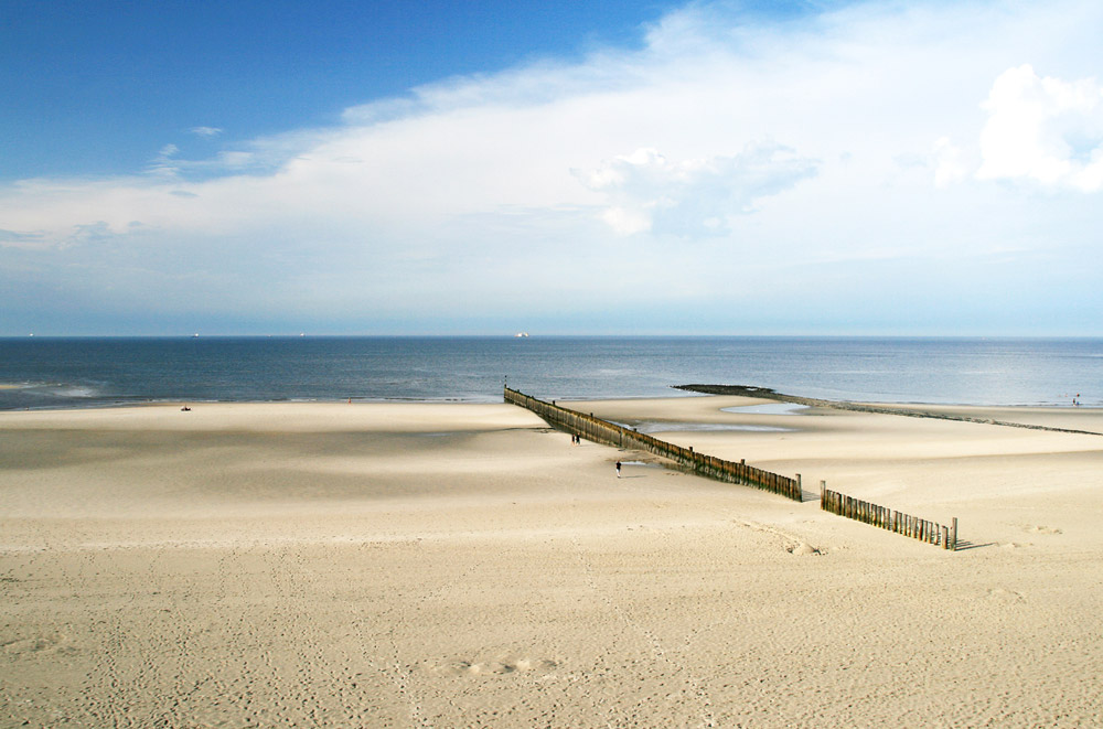 Es hat kurz zuvor noch geregnet, der Sand ist ein wenig feucht. Dort unten sehen wir den Strand bei Niedrigwasser, nur die Spitzen der Pfahlbuhne und der Buhne »L« befinden sich im Wasser.