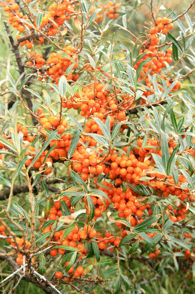 ‹ Die orangefarbenen Früchte des Sanddorns bestechen durch einen äußerst hohen Vitamin-C-Gehalt, man kann sie im Spätsommer ernten.