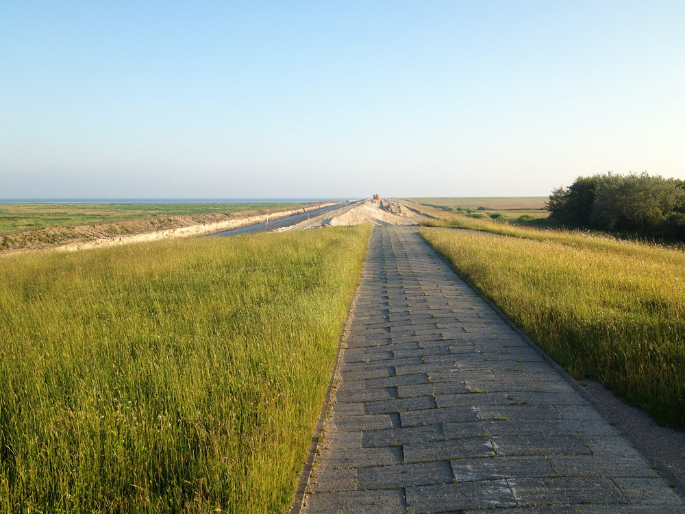 Hier sehen wir sowohl den alten Ostgrodendeich (im Vordergrund) als auch den im Bau befindlichen neuen Deich, dessen schützende Kleischicht allerdings noch fehlt.