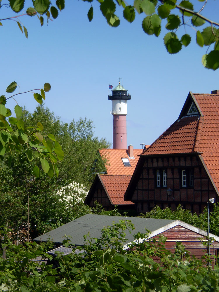 ‹ Der Leuchtturm thront über dem Dorf. Das Gebäude im Vordergrund befindet sich am Ende der Straße »Am Alten Deich«.