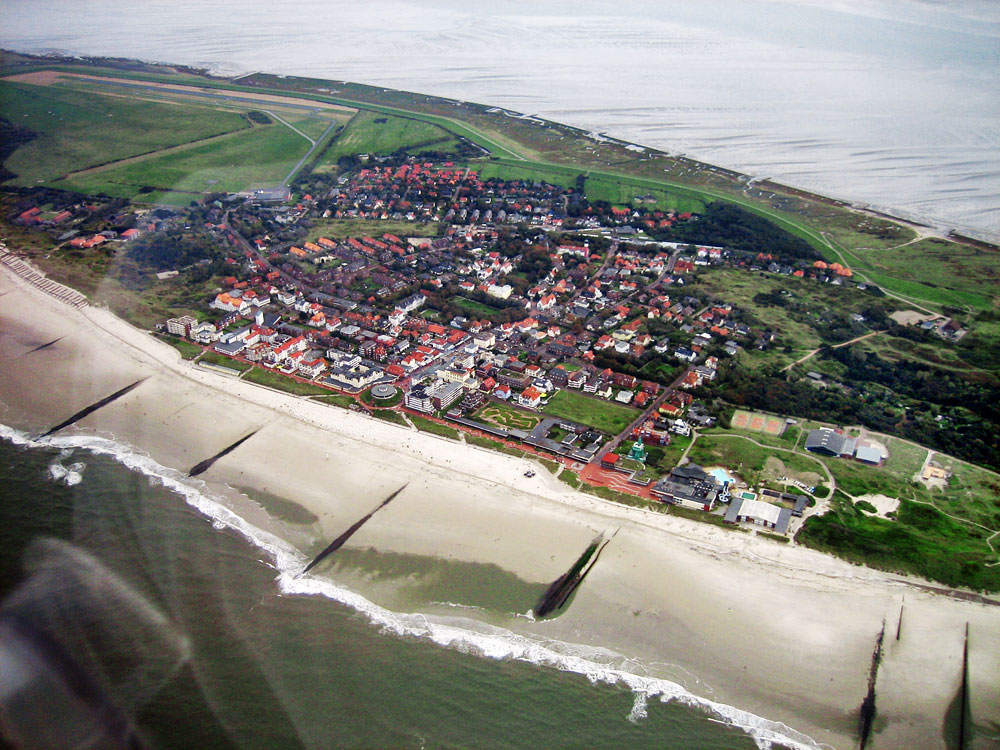 Unten sehen Sie den Strand bei Niedrigwasser, darüber die Strandpromenade mit »Café Pudding« und wiederum schräg darüber die »Zedeliusstraße«, die sich quer durchs Dorf zieht. Oben links im Bild ist der Ostinnengroden sichtbar, hier befindet sich die Start- und Landebahn des Flugplatzes. Der Innen- wird vom Außengroden durch einen Deich getrennt, dahinter beginnt das Wattenmeer.