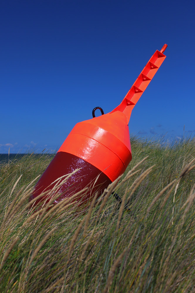 ‹ Direkt an der Strandpromenade wurden im Frühjahr zwei vom Wasser- und Schiffahrtsamt ausrangierte Tonnen aufgestellt – eine Steuerbord- und eine Backbordtonne. Letzere sehen wir hier auf diesem Foto, die Tonne befindet sich nördlich des »Dünenschlößchens«.