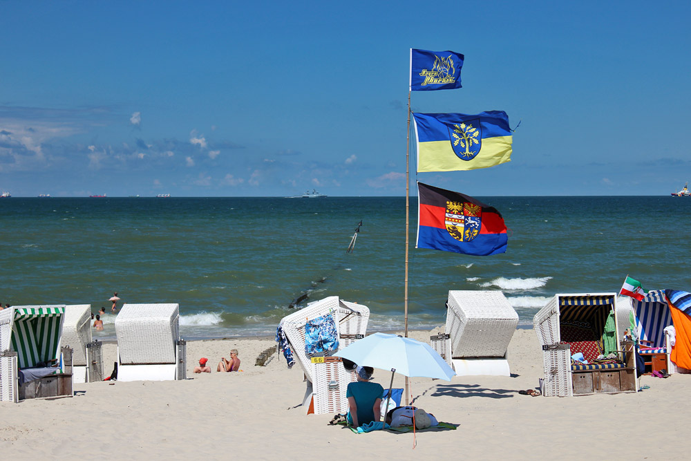 Die Gäste, die den Strandkorb in der Bildmitte gemietet haben, sind mit großer Wahrscheinlichkeit aus NRW, denn über der ostfriesischen Flagge, die ein wenig aus dem Rahmen fällt, wehen die Flaggen der Stadt Hagen sowie vom Basketballverein »Phoenix Hagen«.