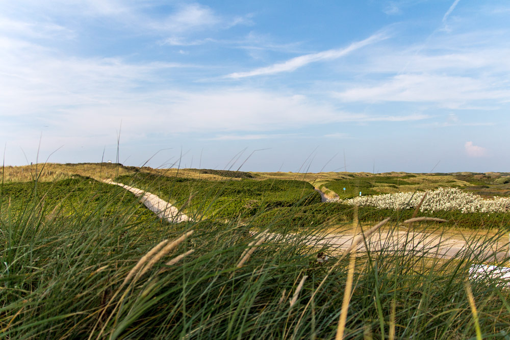Hier ein Blick vom Fuß des Neuen Leuchtturms nach Nordosten. Links sehen Sie eine Dünenüberwegung und rechts die Fläche für Baufahrzeuge und -container externer Wasserbau-Firmen.