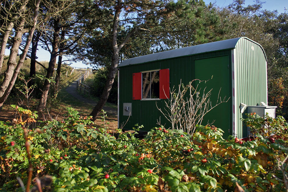 Anhand der grünen Bauwagen mit den roten Fensterläden erkennt man direkt, wo auf Wangerooge die Mitarbeiter des »Wasser- und Schiffahrtsamtes Wilhelmshaven« im Einsatz sind – in diesem Falle im Bereich der Überwegung »Kläranlage«.