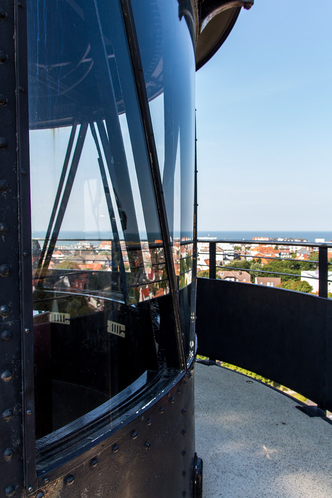 ‹ Wir befinden uns auf dem Alten Leuchtturm, links hinter der Scheibe befand sich einst das Leuchtfeuer, das im festgelegten Takt sein Licht über Insel und Meer erstrahlen ließ.
