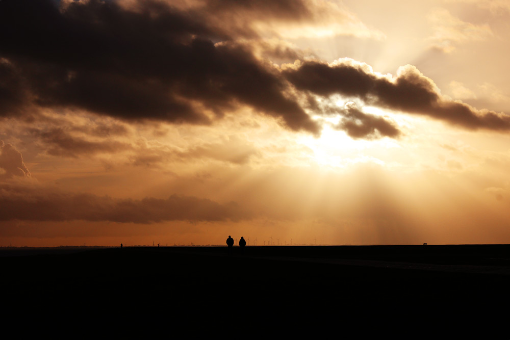 Die Insel ist kurz vor Silvester zwar voll, besonders viele Spaziergänger sind dennoch nicht auf dem Ostgrodendeich unterwegs. Zwischen den Wolken lugt die tiefstehende Sonne hervor.
