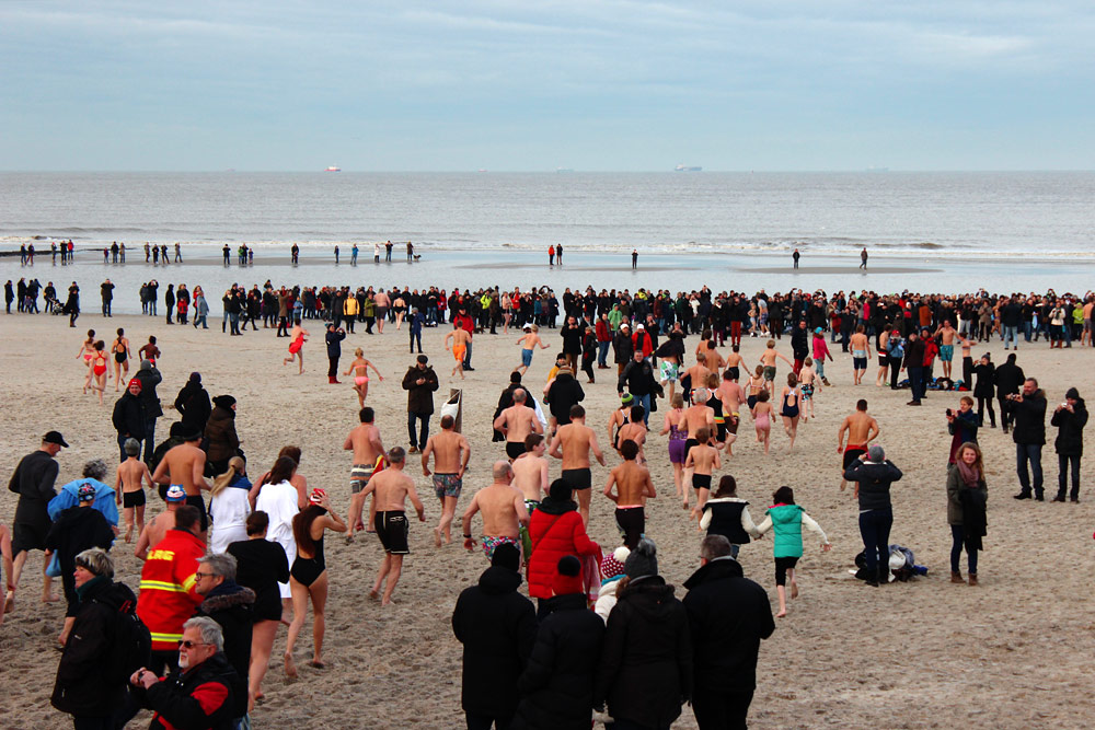 Beobachtet von rund 1500 Schaulustigen, stürzen sich die 121 Teilnehmer des Jahres-Abbadens in die kalten Fluten.