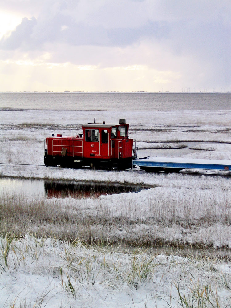 ‹ Die Schöma-Lok »399 107-2« durchfährt das schneebedeckte Deichvorland auf ihrer Fahrt vom Anleger in Richtung Inseldorf.