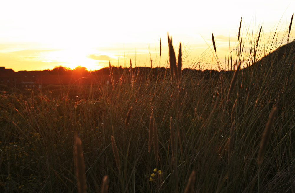 Herrlich, wie die tiefstehende Sonne das Dünengras an seinen Rändern goldfarben erstrahlen läßt! Unterhalb der gleißenden Sonne ist außerdem schemenhaft das »Bielefelder Heim« auszumachen.